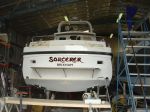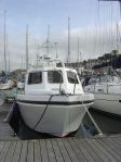 Hi all, thanks for all the compliments about my new boat, I am pleased to say that my wait is finally over and 'Sorcerer' has today been launched. I am over the moon with her and am really looking forward to handover once sea trials and final fitting are completed, probably late next week if all goes okay. Blue Water Boats in Plymouth have done an excellent job and I was mightily impressed that they were pretty much bang on with where the water line actually is, considering it was a somewhat unknown with the V.drives. She weighed in at nine and a half tons with almost full fuel tanks. Will be interesting to see how she performs with the twin Volvo 370's, but they are holding a competition at B.W.B. and have all chipped in a quid each with their guesses......anyone else wanna free guess??? Cheers for now......I'm going down the boat for another look to make sure I'm not dreaming!! Dave.