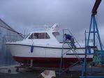 Hi all, thanks for all the compliments about my new boat, I am pleased to say that my wait is finally over and 'Sorcerer' has today been launched. I am over the moon with her and am really looking forward to handover once sea trials and final fitting are completed, probably late next week if all goes okay. Blue Water Boats in Plymouth have done an excellent job and I was mightily impressed that they were pretty much bang on with where the water line actually is, considering it was a somewhat unknown with the V.drives. She weighed in at nine and a half tons with almost full fuel tanks. Will be interesting to see how she performs with the twin Volvo 370's, but they are holding a competition at B.W.B. and have all chipped in a quid each with their guesses......anyone else wanna free guess??? Cheers for now......I'm going down the boat for another look to make sure I'm not dreaming!! Dave.